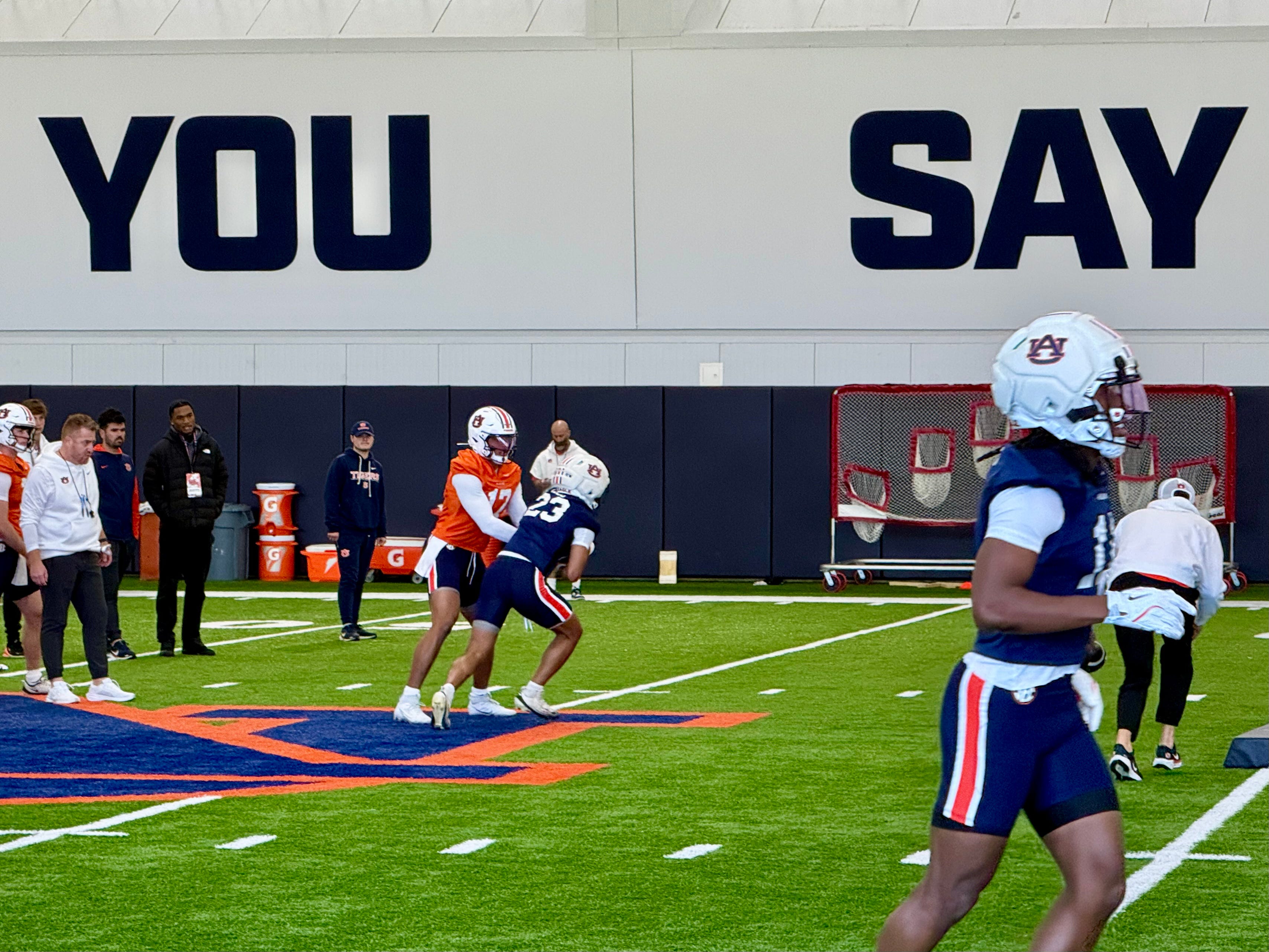 Well, it mostly hit the turf. Near-freezing temperatures on the Plains brought a lot of Auburn football’s first spring practice under Alex Golesh into the indoor facility Tuesday morning. But some position groups hit the cold air on the outdoor fields.