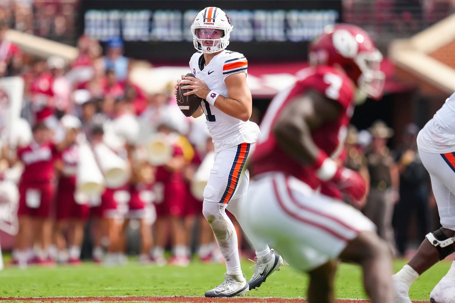 In the second half, Auburn had a drive start with a 44-yard run into Oklahoma territory. The next pass, a double move for a clear-cut touchdown by Cam Coleman, was thrown too far by Jackson Arnold. That was followed by another incompletion, a false start and a short pass on third-and-long. The Tigers then asked a kicker to make his first field goal attempt of the season from 50 yards. It missed.