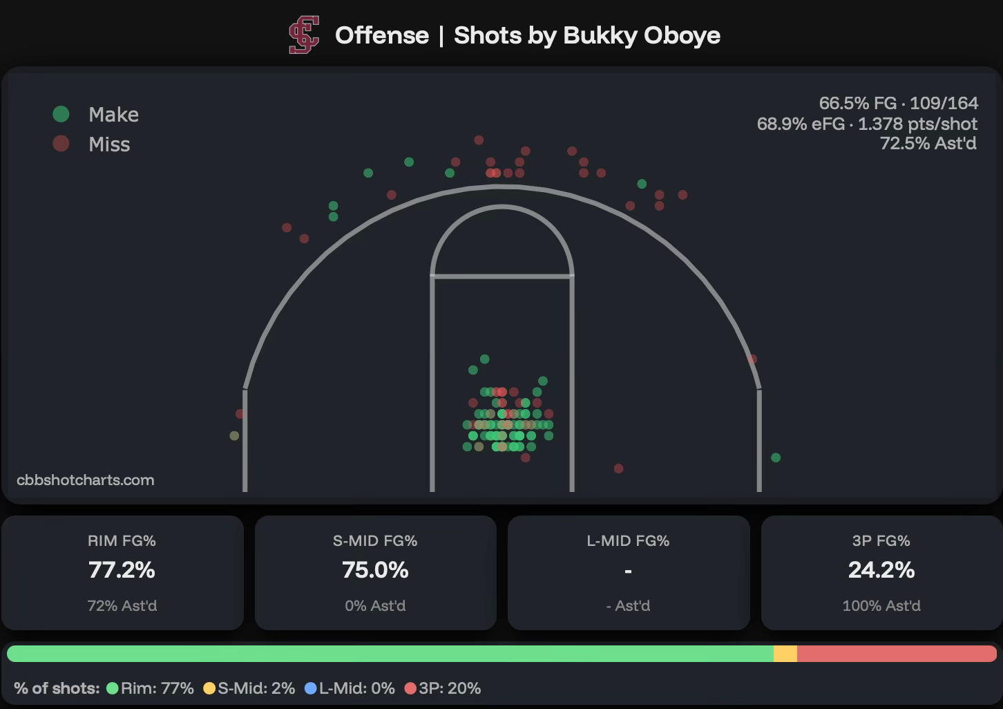 Oboye went 102-132 (77.3%) on 2-point attempts, which led all of Division I.